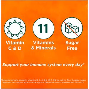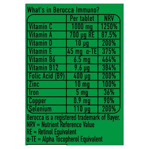 How does Berocca® immuno work? Vitamins D, C, A, Zinc, Copper, Iron & Selenium support your immune system. Vitamins B6 & B12 support energy release & Vitamin B9 helps reduce tiredness & fatigue.