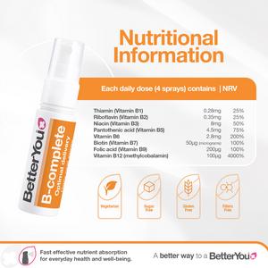 Get a complete dose of essential B vitamins with BetterYou Vitamin B-Complete Oral Daily B-Vitamins Spray. This daily use oral spray provides a blend of B vitamins, including B12, B6, and folic acid, to support energy production, metabolism, and overall health. B-Vitamins Spray Benefits: Supports metabolism and digestion Helps maintain healthy skin, hair, and nails Expertly blended 8 B-vitamins to support natural energy production. Fresh-tasting, natural peach, plum and raspberry flavour. Packaging made from carbon negative, plant-based plastic. Usage: Shake well before use. Spray three puffs directly into the cheek, once daily. For children under three years old, consult a healthcare professional.