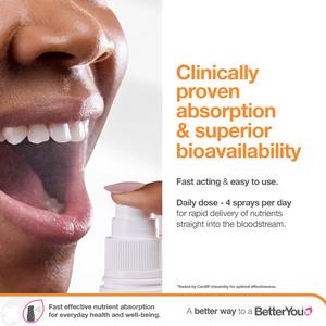 Get a complete dose of essential B vitamins with BetterYou Vitamin B-Complete Oral Daily B-Vitamins Spray. This daily use oral spray provides a blend of B vitamins, including B12, B6, and folic acid, to support energy production, metabolism, and overall health. B-Vitamins Spray Benefits: Supports metabolism and digestion Helps maintain healthy skin, hair, and nails Expertly blended 8 B-vitamins to support natural energy production. Fresh-tasting, natural peach, plum and raspberry flavour. Packaging made from carbon negative, plant-based plastic. Usage: Shake well before use. Spray three puffs directly into the cheek, once daily. For children under three years old, consult a healthcare professional.